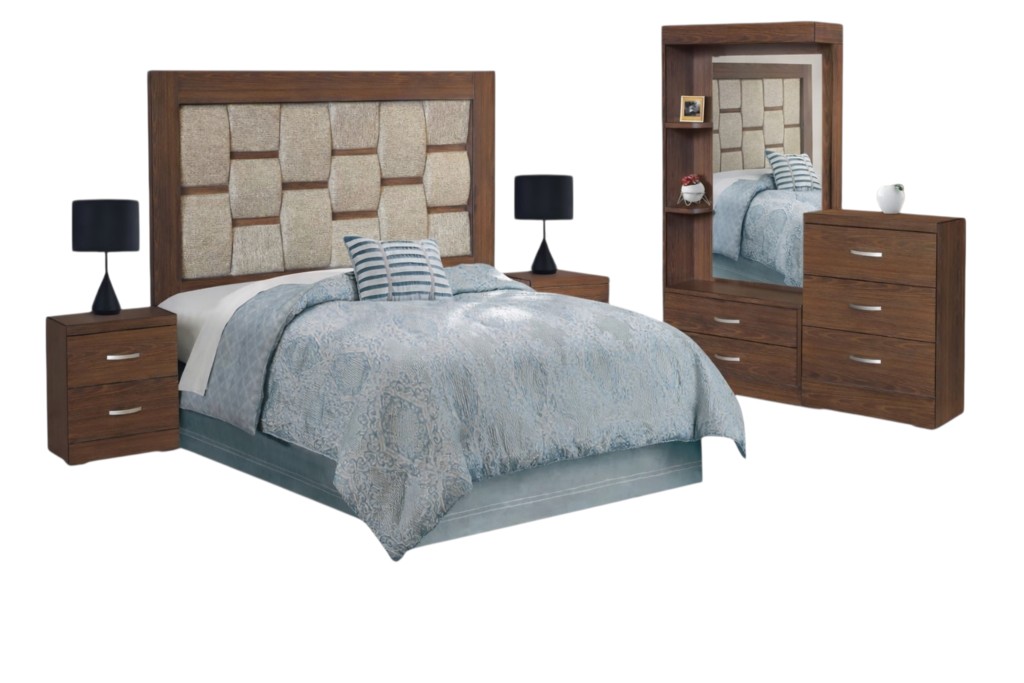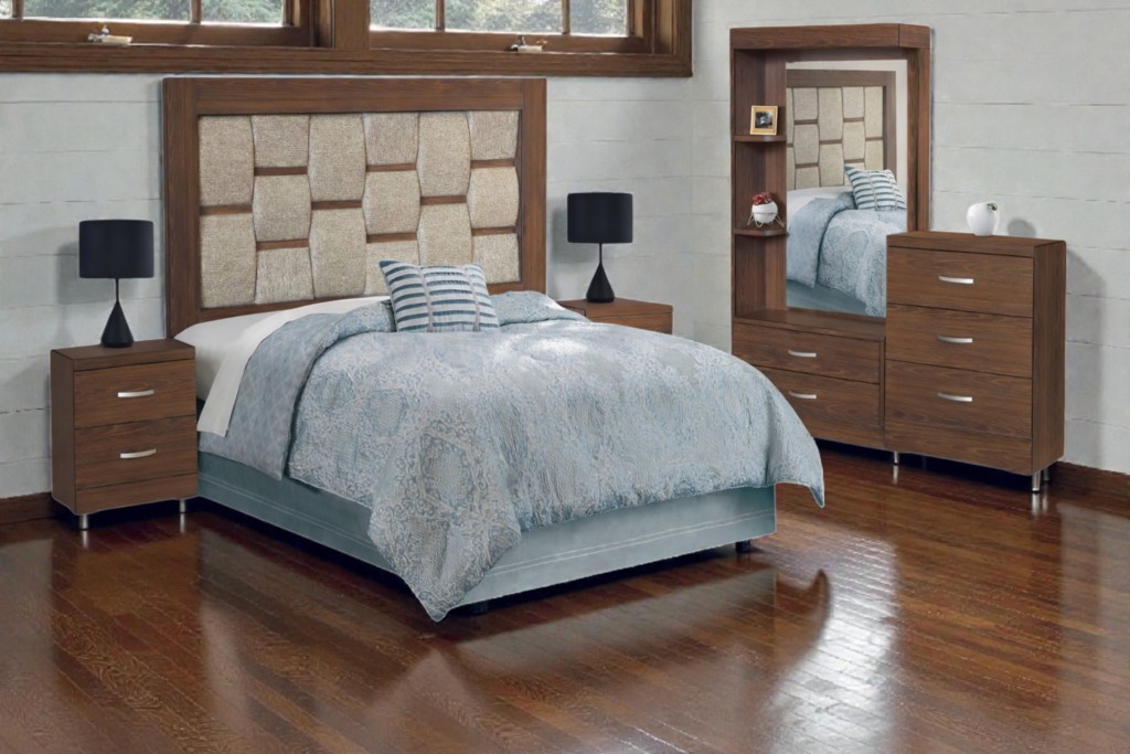 Cuenta con un cabecero tapizado en tono claro, con diseño acolchado que brinda confort y un atractivo contraste con la madera. Los burós complementan el conjunto con líneas modernas y cajones funcionales para una organización práctica.